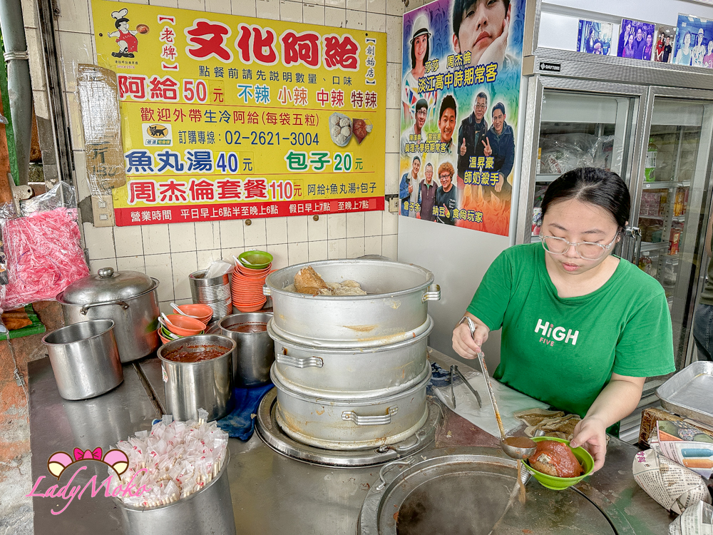 來淡水想吃道地阿給、淡水美食,絕對要從真理街這條「阿給一條街」開始!從馬偕街走上來就能看到連三家阿給名店,其中人氣最旺、排隊人潮最多的就是《文化阿給》,開業40幾年,網路評價超過6000則!淡水老字號阿給店,不只吸引無數觀光客,許多名人都曾造訪,甚至還有「周杰倫套餐」阿給、魚丸湯、肉包一次滿足。記得一定要加湯、加醬才是正宗吃法,吸飽醬汁的冬粉香氣十足,特製醬汁鹹甜涮嘴,是淡水必吃的經典老店!附上完整菜單價格。