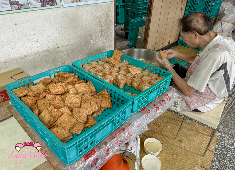 一旁辛苦的爺爺一直在包阿給,一個一個將豆皮撐開後,塞進滿滿的冬粉。
