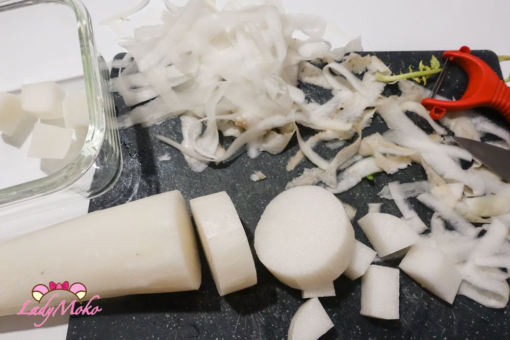 1. 將白蘿蔔洗乾淨、削皮,切成想要的大小,我自己是切成小塊。