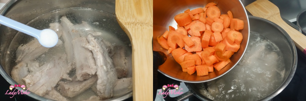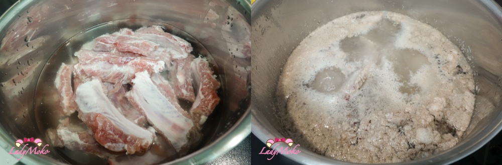 5. 排骨用麵粉洗乾淨後,我習慣在第二道手法去腥,排骨冷水下鍋,開大火煮滾,水滾後持續約 1-2 分鐘後即可關火。